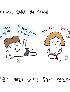 캐릭터31 [그림일기]더워서 숨기바쁜 요즘 날씨 요즘 너무너무 날씨가 덥다.밤 낮 할것 없이 너무 덥지만, 낮에 어쩔 수 없이 외출을 감행해야 할 때는..진짜 어디 쫓기는 사람처럼 숨어다니기 바쁘다. 햇빛을 조금이라도 피하고자...그림에서는 전봇대가 있어서 다행이지 횡단보도 기다리는데 그늘조차 없으면 정말 잠시도 서있기 힘들다.순식간에 땀이 등줄기에 내리고, 햇살은 뜨겁다못해 따갑다... 되도록이면 한낮에 외출은 피하는게 좋겠다 ㅠㅠㅠㅠㅠㅠ 2018. 7. 19. 다음생에서도 엄마로 태어나줄 수 있어? 항상 엄마에게 물어보고 싶었던 질문이 있었다. 이기적인 질문인 걸 알면서도 ... 간절하다고 평상시부터 느끼고 있었던 질문."엄마는 다음생에서도 내 엄마로 태어나줄 수 있어?" 평상시에 엄마랑 워낙 친구처럼 터울없이 지냈기에 아무 생각없이 엄마한테 물어봤다.당연히 돌아올거라고 예상한 엄마의 대답은"야 이놈아, 다음생에는 너같은 아들로 태어날꺼야." 였는데... 고심을 하더니 만약 그렇게 될 수 있다면 너네가 속을 썩이길 했니 뭘했니 라며"엄마는 다시 태어나도 엄마로 태날 수 있지 그럼."이었다. 역시, 엄마는 엄마였다.엄마가 왜 엄마일 수 있는지 알 수 있는 대답이었다.엄마앞에서 겉으론 웃고 있었지만 속마음은 참 고맙기도하고 미안한 마음이 너무 너무 들었다.늦지 않았으니 지금부터 더 더 더 더 더 효도하.. 2018. 7. 17. 엄마의 능력은 어디까지일까 내가 술을 마시면 술냄새가 엄청 심하게 난다. 맥주 500cc를 마시던, 3000cc를 마시던, 소주 3-4병은 마신 사람처럼 술냄새가 난다. 항상 집에 들어오면 엄마아빠한테 가서 "엄마~~ 아빠~~ 아들왔어~~~" "으유~ 술냄새 이놈아, 너같은 아들 둔적 없어!!" 하는 반응이 너무너무 재밌어서 자꾸자꾸 하게 된다. 어제도 술을 맥주만 마시고 들어왔는데 엄마가 소주 댓병은 마신 사람처럼 술냄새 나니까 빨리 가서 씻고 자라고 내팽게쳤다... 그래서 호다닥 씻고 방에 들어가자마자 드르렁드르렁 잠을 잤고, 자면서 내일 아침에 진짜진짜 얼큰한 콩나물국 먹고 싶다... 생각하면서 잠들었는데, 맙소사. 다음날 아침에 냄비에 보기만해도 엄청 얼큰해보이는 콩나물국이 떡하니 있지 않은 것인가...엄마의 힘은 어디까지.. 2018. 7. 13. [그림일기] 시간에 끌려 다니는 하루하루 언제나 느낀거지만 하루 24시간 정말 짧은 시간이다. 일주일도 무섭게 지나가는데 벌써 5달 뒤면 2018년도도 끝이다. 내 시간을 얼마나 효율적으로 썼는지는 과거를 뒤돌아 봤을 때 남아 있는 것의 유무로 따질 수 있겠지. 요즘들어 시험을 칠 땐 시험에 집중하고, 책을 읽을 땐 책에 집중해야 하는데, 도통 어느 것에도 집중하지 못하는 느낌이다. 그림을 그리다가도 집중을 못하고, 예전만큼 집중하지 못하고 산만해졌다. 이유가 뭘까. 24시간이라는 시간을 두고 예전처럼 시간을 잘 쪼개서 쓰기 보다는 "어랏 2시네, 어랏 벌써 5시네"하고 넘기는게 커서 그런가... 예전에 사람의 습관이 바뀌는데 걸리는 시간이 21일이라고 하는 프로그램을 본적이 있다. 작심삼일도 7번만 하면 습관이 바뀐다는 얘기다. 21일만 새로.. 2018. 7. 10. 대만여행 다녀오다 대만 여행을 다녀왔다. 처음 여행해본 대만은 좋은 기억만 있다. 얼마 전 다녀온 홍콩과 비슷하다고 느꼇지만, 사람들이 타지인을 대하는 태도랄까? 부터 달랐다. 몹시 친절하고 부드럽다. 게다가 한국말도 툭툭 나오는 모습에 웃음이 사라지질 않았다. 여행을 하면서 어느 장소를 가든 일정하게 드는 생각이 있다. 첫번째, 너무너무 이뻐서 부모님이랑 나중에 한번 더 오고 싶다.둘째, 여기서 만난 사람들이 너무 좋아서 다음번에는 한국이나 우리동네에서도 따로 만나면 좋겠다. 어딜 가든 부모님 생각은 항상 떠오르고, 좋은 사람들은 꼭 한번 우리동네의 좋은 곳을 구경시켜주고싶은 생각이 든다.언제, 어딜가든 이유 불문하고 떠오르는 생각들이다. 그래서 이번 대만여행에서도 느낀건 참 많지만 저 두가지는 꼭 ...!올해가 가기 .. 2018. 7. 9. 네이버 감성충전탭 메인에 그림일기 등재 요즘 네이버 OGQ마켓에 네이버 블로그,댓글 전용 스티커를 올리기 위해 그림을 그리다 항상 늦은 취침과 늦은 기상이 일상이 되어버렸다. 그렇게 여느떄와 다름없이 늦은 아침에 눈을 뜨고 블로그와 이메일, 그림들 업로드 하는 것을 살펴보는데... " 응? " 오늘따라 이상하게 한 작품의 조회수가 기하급수적으로 올라가 있다. 바로 퇴사하면서 그렸던 그림일기다. 조회수가 아침기준으로 2,000회에 육박했다. 사실 모든 그림들이 그라폴리오에서는 조회수 10안팎에 그쳐 있었기에 이게 무슨 일인가 싶었다. 천천히 다른 작품들도 살펴보았더니, 홍삼 에피소드가 그 다음으로 높았고 전체적으로 조회수가 급 상승해 있었다. 알림을 눌러서 확인해보니 댓글이 달려 있다. 이게 무슨 말인가...? 내가 그 네이버 감성충전 탭에 메.. 2018. 6. 30. 단계가 올라가면 다시 시작하는 세상 매번 느꼇던 세상이다. 초등학교 6학년으로 가장 위를 올라서게 되면 다시 중학교 1학년으로 바닥에서 시작을 하고, 중학교 3학년에서 또 다시 고등학교 1학년으로 내려가서 시작을 한다. 그러다 대학교1학